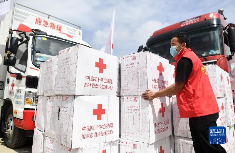 8月19日,青海省紅十字會志愿者在大通一中臨時安置點整理救災物資準備發放。新華社記者 張宏祥 攝