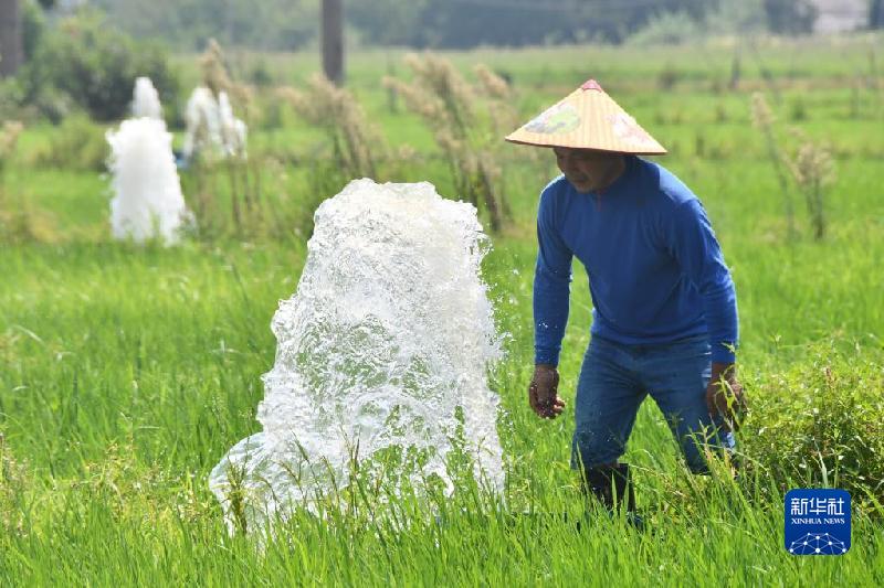 湖南省益陽市資陽區迎風橋鎮鄒家橋村村民在使用抗旱井打出的水進行灌溉。新華社記者 周勉攝
