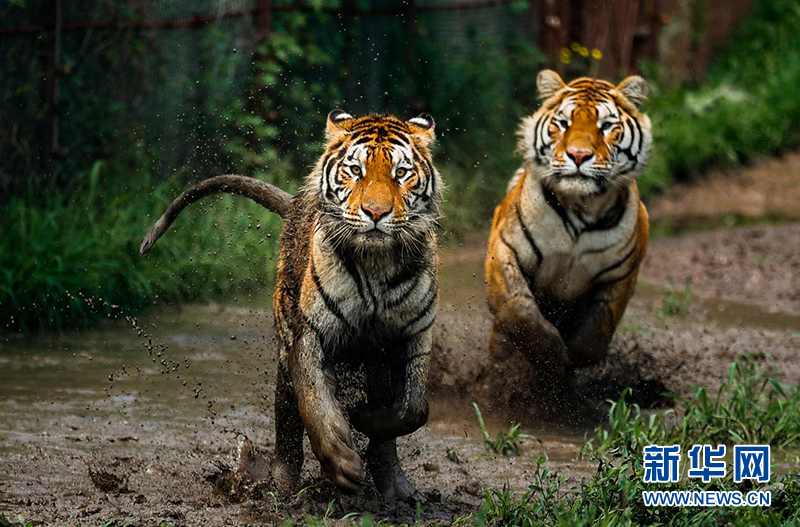 圖為東北虎在泥潭里追逐奔跑。新華網發