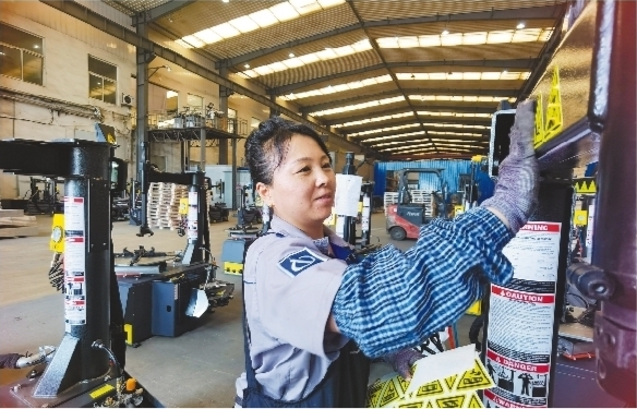 營口市大力汽保設備科技有限公司生產車間內,工人給輪胎拆裝機粘貼標識。楊梅 攝