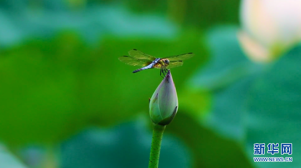 在蓮花湖濕地公園,一只蜻蜓停在荷花上。