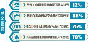 根據《規劃》,到2025年,我省通過輸供水工程建設進一步聯網、補網,省級骨干水網覆蓋范圍由45%提升至58%,農村規?;┧こ谭杖丝诒壤?5%提升至35%,農村自來水普及率由82%提升至88%。同時進一步完善防洪減災體系,將重點江河5級以上堤防達標率由63.7%提升至75%;具有應急備用水源的城鎮比例由34%提升至70%;地表水水質達到或優于Ⅲ類水體比例由74.4%提升至78.7%。全省用水總量嚴格控制在162億立方米以下,萬元工業增加值用水量下降率達到12%。