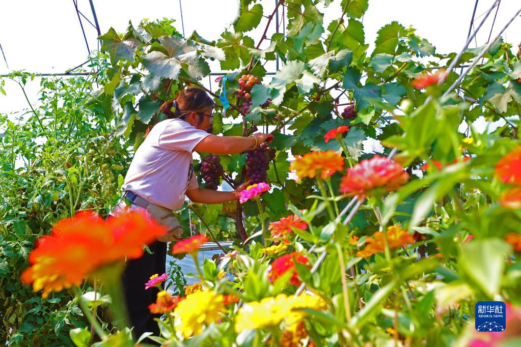 9月6日,在丁家房鎮大蛇山子村,果農在大棚里采摘葡萄。新華社記者 楊青 攝