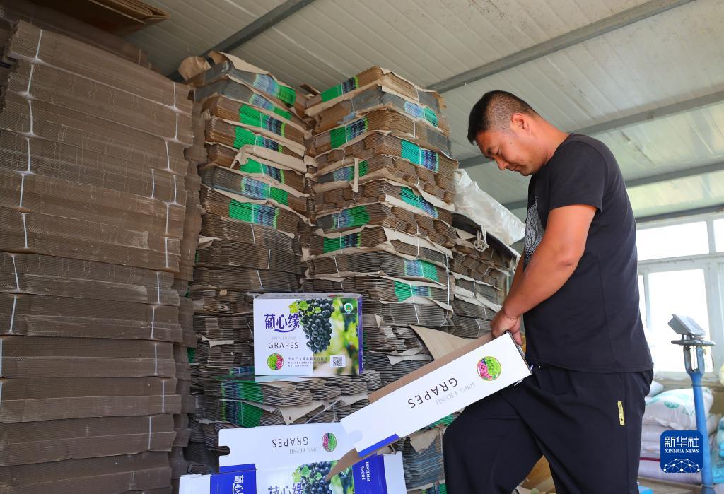 9月6日,在丁家房鎮大蛇山子村,果農在整理葡萄包裝盒。新華社記者 楊青 攝