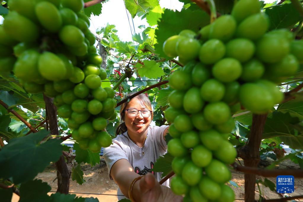 9月6日,在丁家房鎮大蛇山子村,果農在大棚里查看葡萄成熟情況。新華社記者 楊青 攝