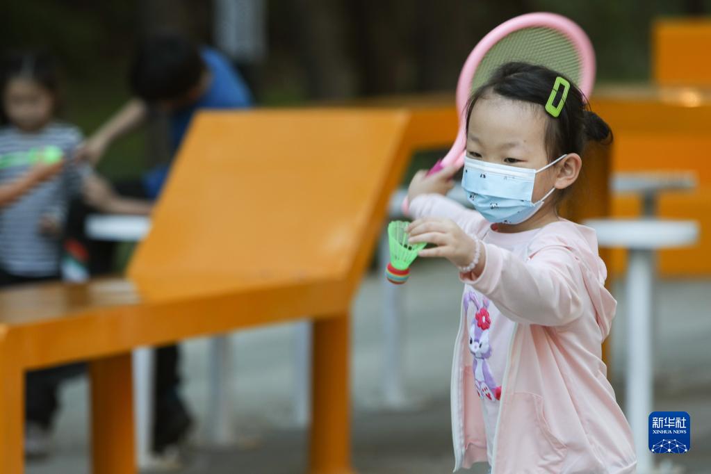 9月7日,一名小朋友在沈陽市和平區文體西路一處“口袋公園”內玩羽毛球。新華社記者 王乙杰 攝