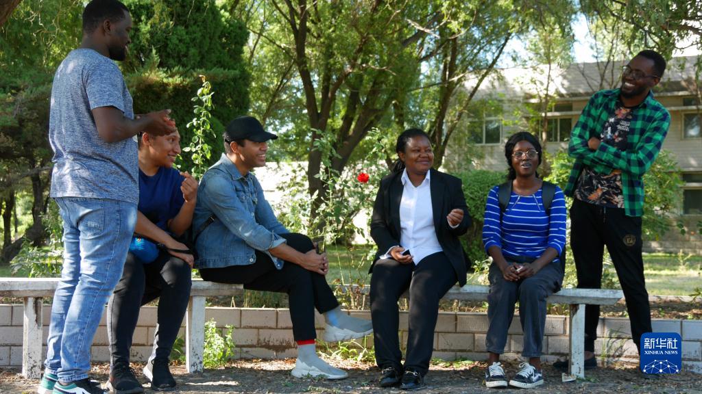 9月5日,張寧(右三)和留學生在操場上聊天。新華社記者 楊青 攝