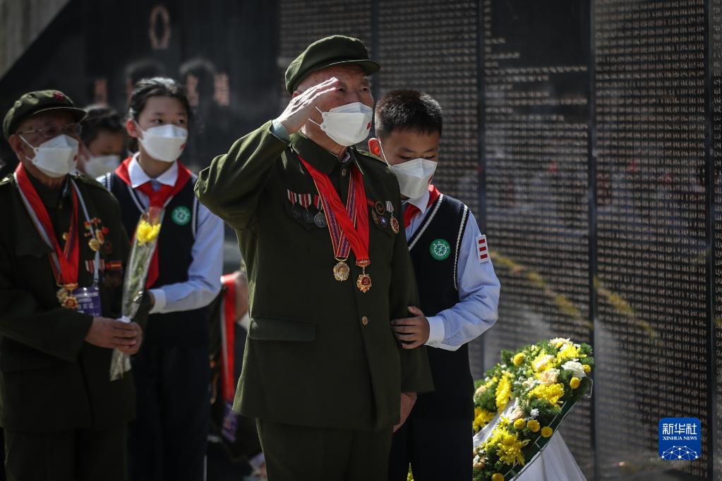 9月17日,志愿軍老兵崔龍福向烈士英名墻敬禮。新華社記者 潘昱龍 攝