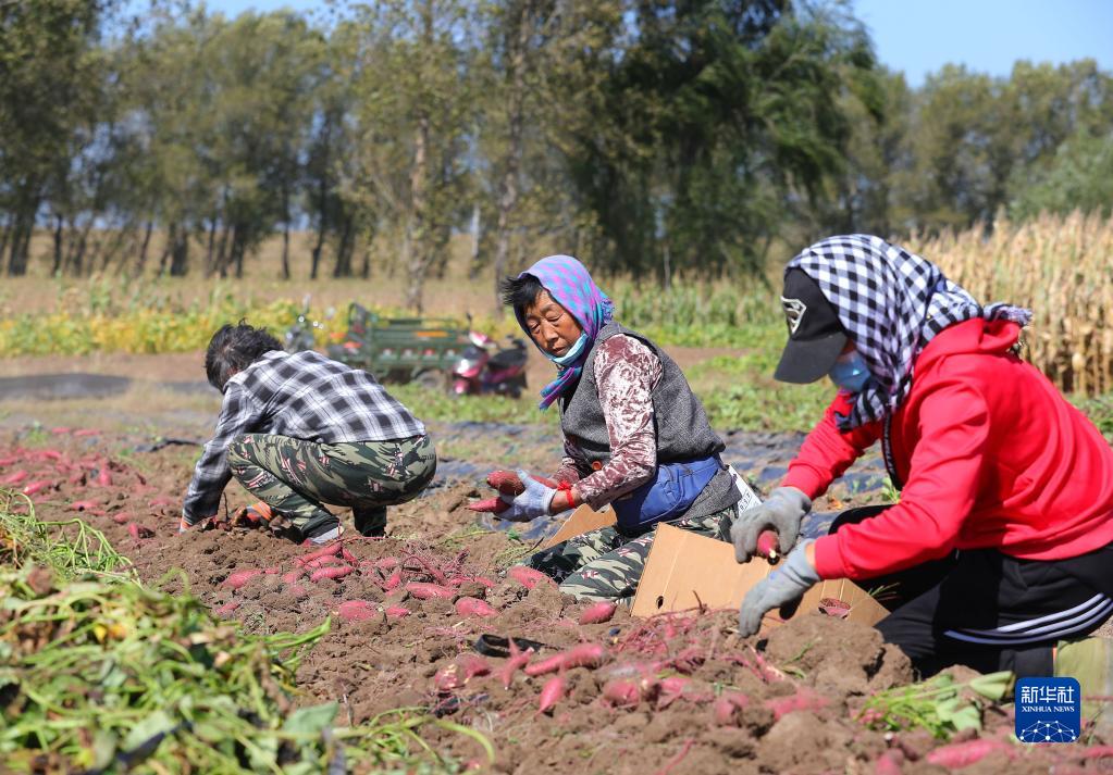 9月21日,在康平縣方家屯鎮十家子村,農民在地里收獲紅薯。近日,在遼寧省沈陽市康平縣方家屯鎮,康平紅薯、蘋果、小米等特色地標農產品豐收在望,農民在田間果園采摘勞作。據統計,康平縣今年種植小米5000余畝、寒富蘋果3.5萬畝、紅薯近2萬畝,均喜獲豐收。新華社記者 楊青 攝