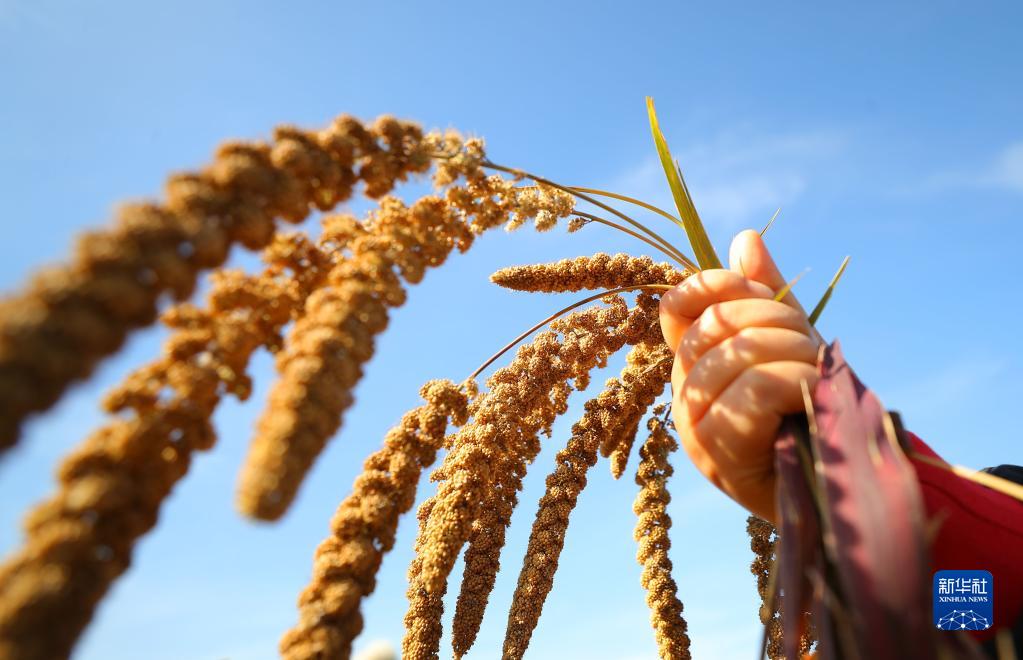 9月21日,在康平縣方家屯鎮東小陵村,農民展示收割的谷穗。新華社記者 楊青 攝