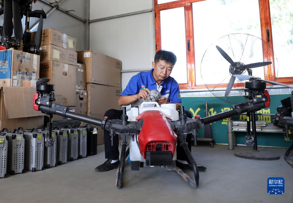 9月19日,種糧大戶盛鐵雍對植保無人機進行保養。新華社記者 姚劍鋒 攝