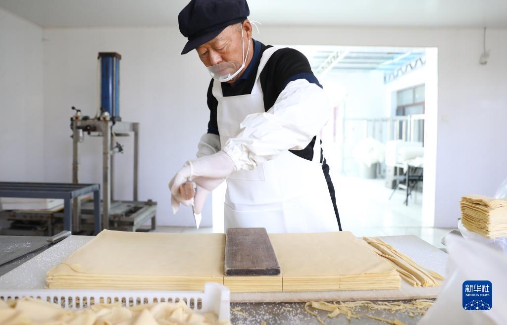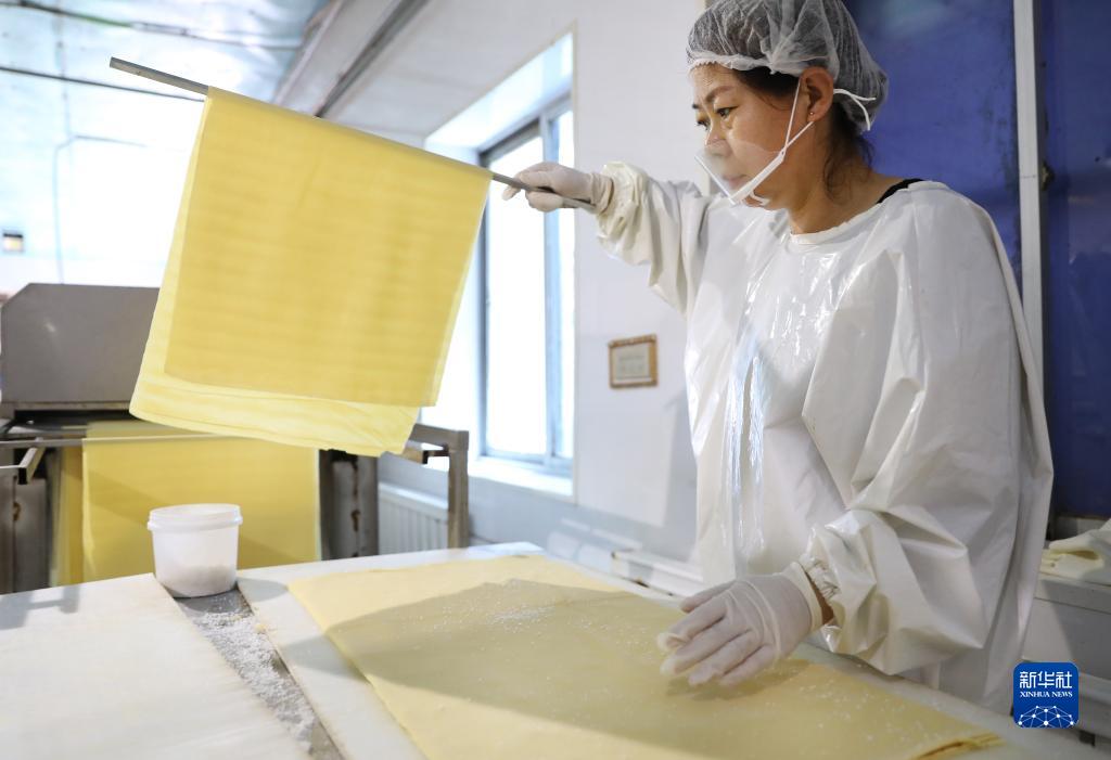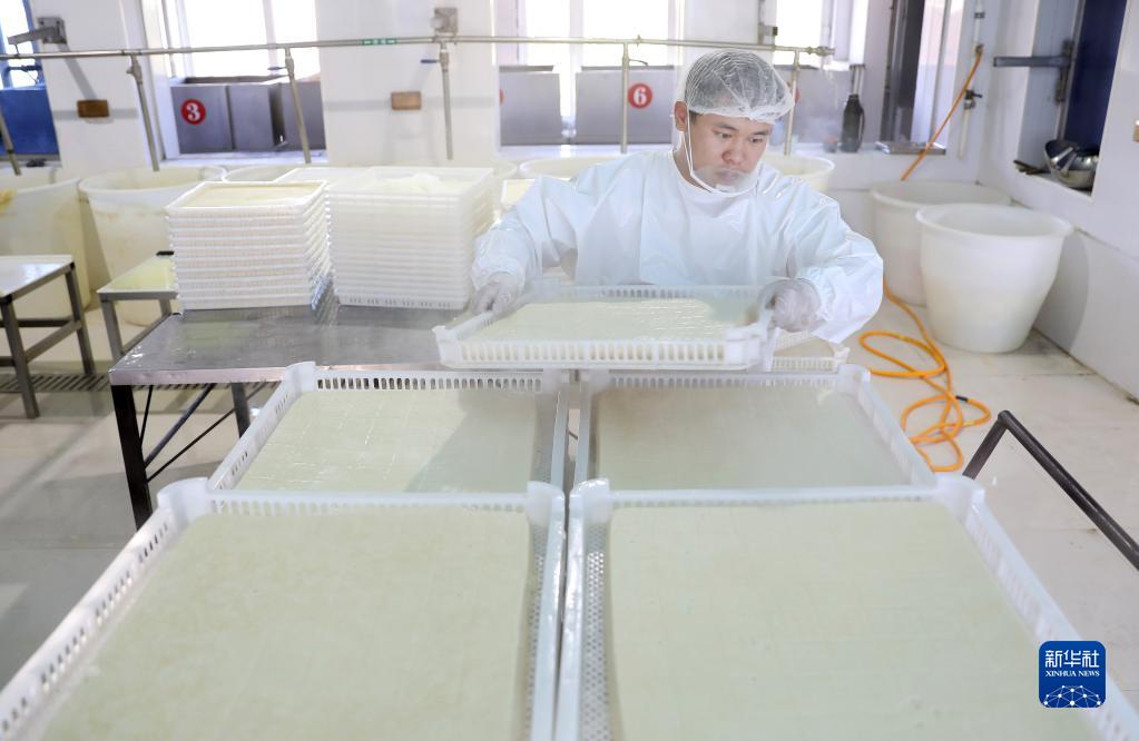 9月19日,工人在昌圖紅瑞食品釀造有限公司生產車間內切割干豆腐。新華社記者 姚劍鋒 攝