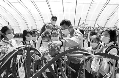“火龍果與仙人掌是同科植物,但火龍果并不是長在仙人掌上?!必撠熁瘕埞N植的姜雷一邊耐心地給孩子們講解有關火龍果的知識,一邊貼心地告訴孩子們,為了方便大家區分,他們特意在火龍果旁種了一棵仙人掌。