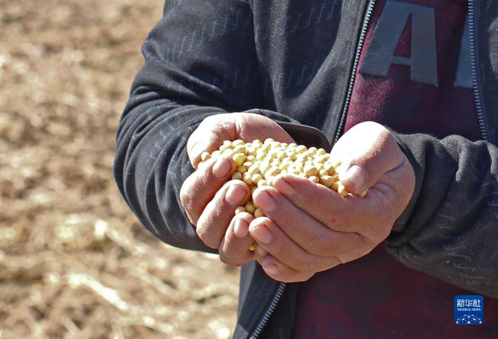 10月7日在遼寧沈陽市法庫縣依牛堡子鎮崔家屯村拍攝的收獲的大豆。新華社記者 楊青 攝