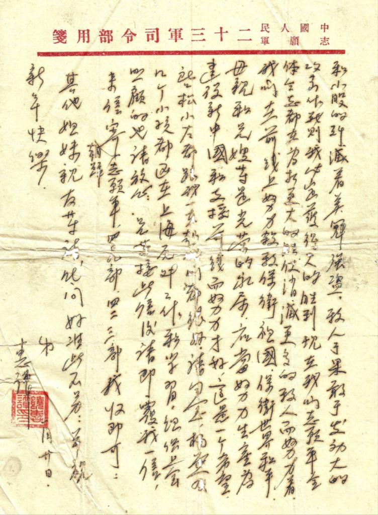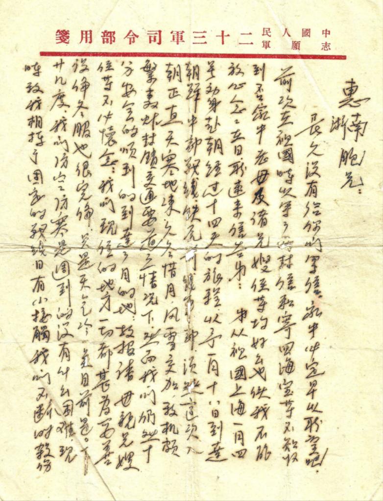 英雄情長,是字字血淚、寸步不讓的家國慷慨。1953年1月20日,中國人民志愿軍第23軍參謀長饒惠譚從抗美援朝前線寄回一封家書,這也是他寫給親人的最后一封信。信中,他描述了前線的狀況,字字句句流露著志愿軍戰士敢打必勝的血性鐵骨。