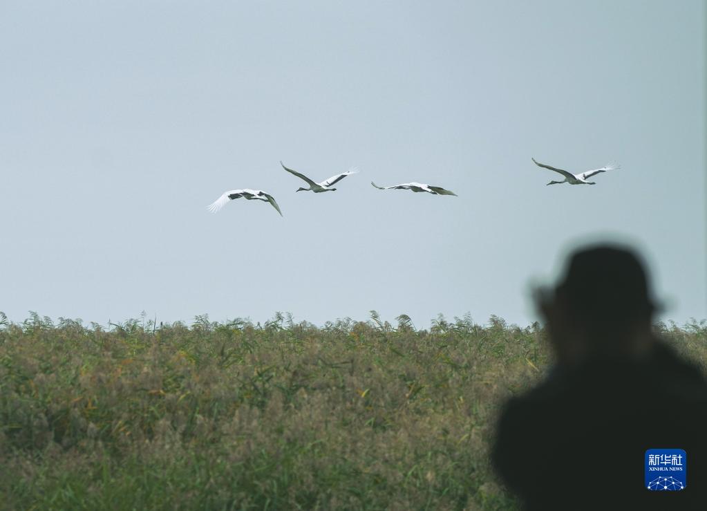 一名攝影愛好者在遼河口國家級自然保護區拍攝丹頂鶴(2022年10月2日攝)。新華社記者 盧星吉 攝