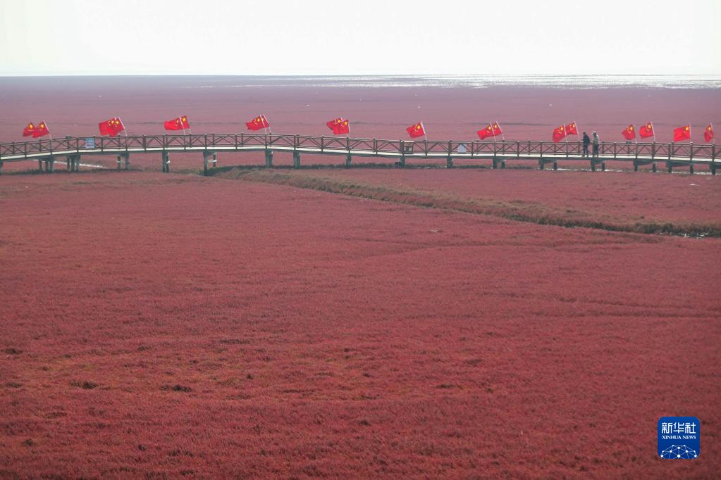 這是盤錦市紅海灘國家風景廊道景區內的紅海灘風光(2022年9月28日攝,無人機照片)。新華社記者 潘昱龍 攝