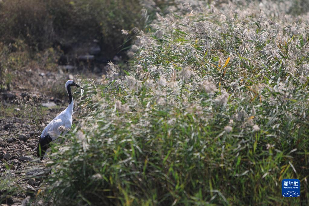 蘆葦蕩旁,一只丹頂鶴正在閑游漫步。新華社記者王乙杰 攝