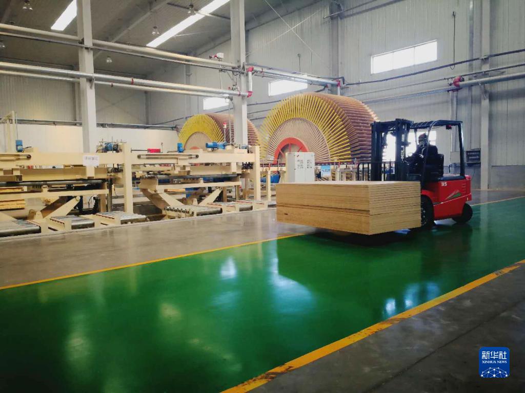 生產車間內,工作人員正在運送由蘆葦制成的板材。(受訪者供圖)