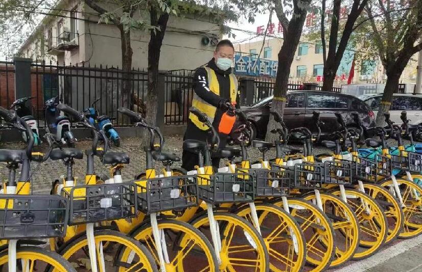 圖為美團單車運維員對沈陽街頭車輛進行無差別消毒。
