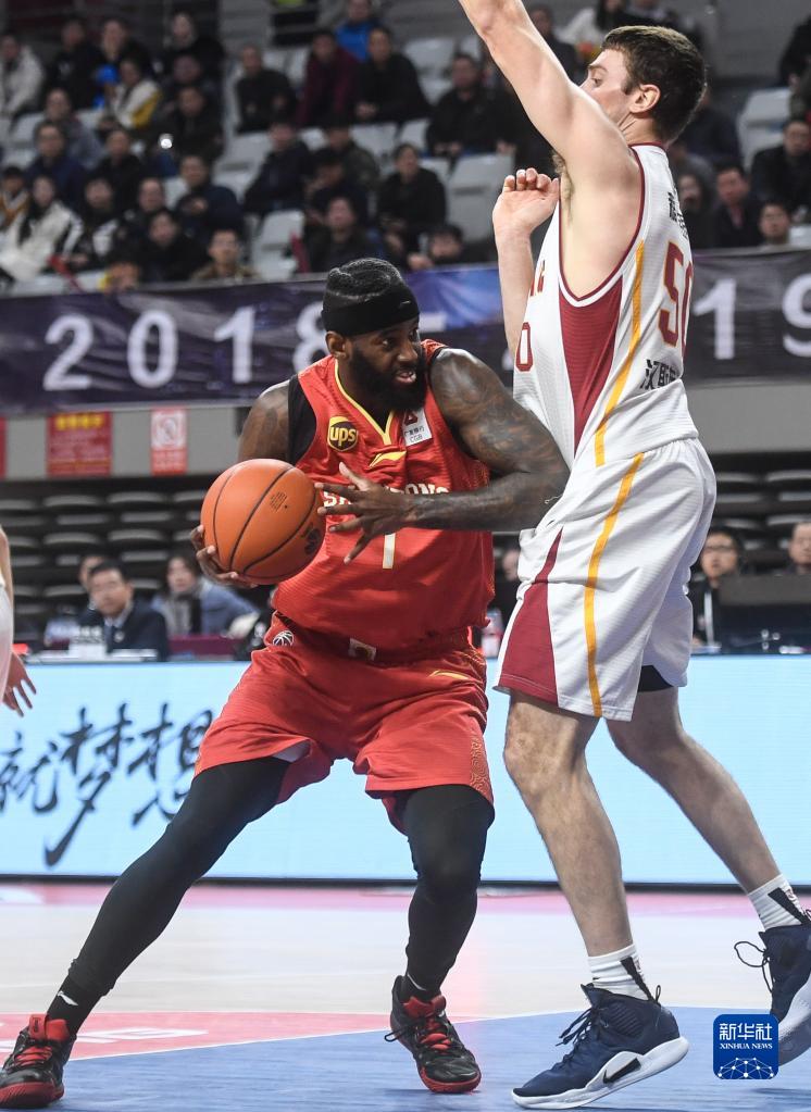 資料圖:2019年1月2日,當時效力于山東西王隊的賈卡爾·桑普森(左)在比賽中進攻。新華社記者 黃宗治 攝