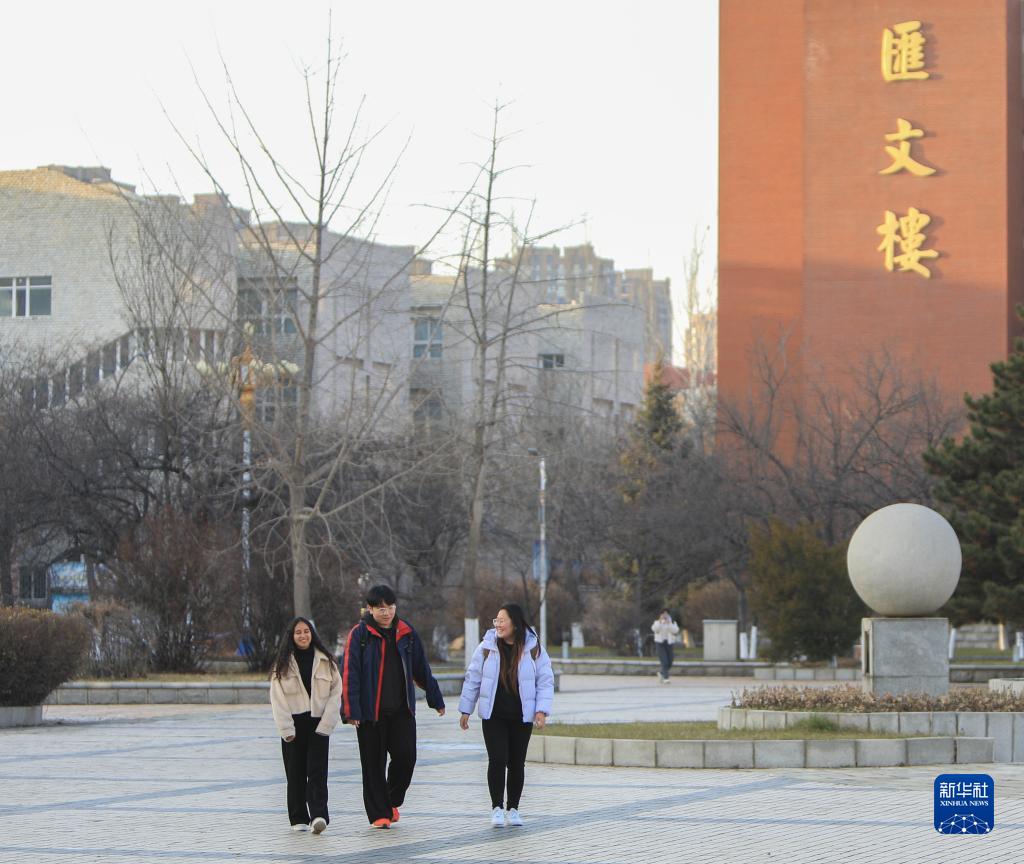 11月16日,白書晴(左)、李文龍(中)和明亮在校園內散步。新華社記者 王乙杰 攝