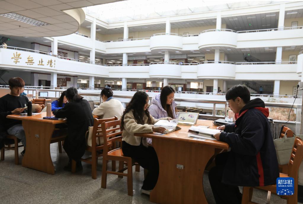 11月16日,李文龍(右一)、明亮(右二)和白書晴(右三)在圖書館查閱京劇相關資料書籍。新華社記者 王乙杰 攝
