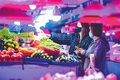 11月24日,市民在農貿市場選購新鮮蔬菜、肉蛋等。