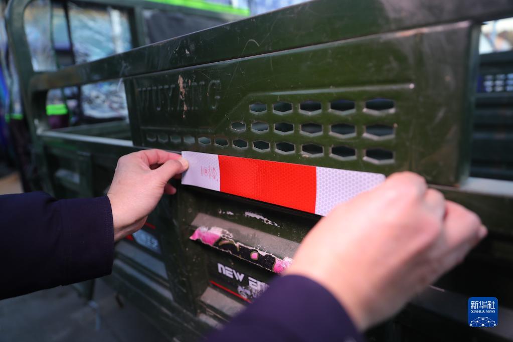 12月1日,沈陽市公安局交通警察局蘇家屯大隊交警給農用三輪車粘貼反光條。新華社記者 楊青 攝