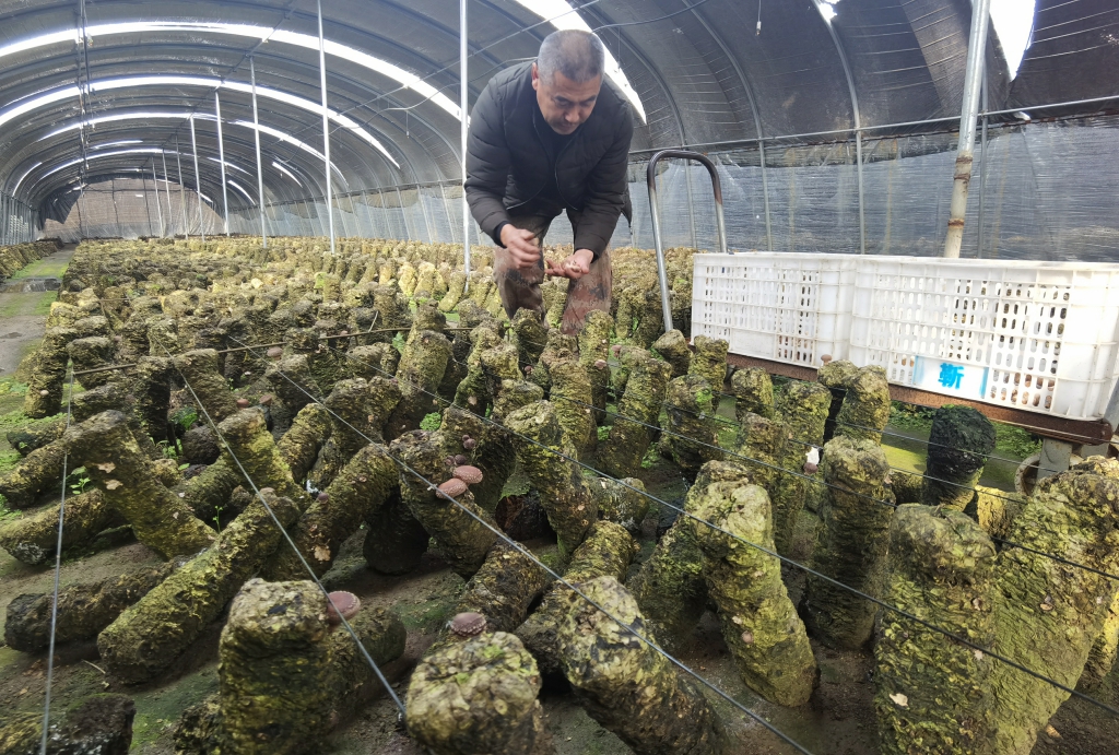 呂王村香菇種植戶張國紅在自家香菇大棚查看香菇長勢。(圖片由受訪者提供)
