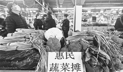 同一時間段,在中興連鎖超市的惠民蔬菜專柜前,一位市民正在選購蔬菜,她選購了一棵大白菜和一些土豆,當天的這兩種菜品的銷售價格均低于當天市場的平均價格。據了解,中興超市目前在全市有5家門店,均設立了惠民蔬菜專柜,每天推出部分蔬菜平價銷售。