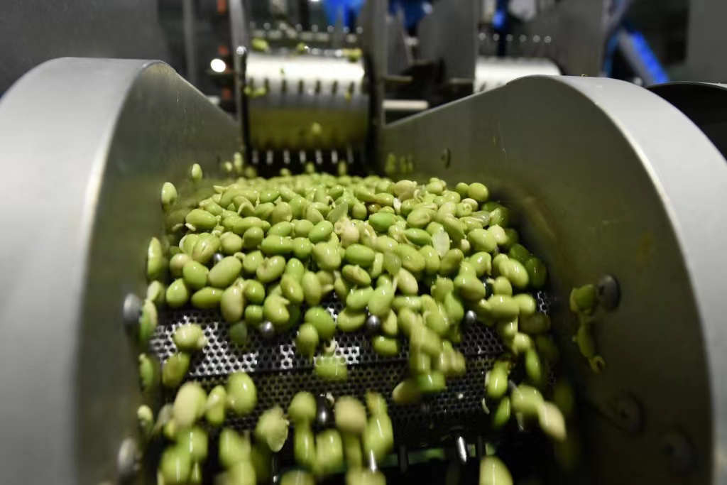 福來公司生產車間內,自動化生產線上翻滾的豆子。(受訪者供圖)