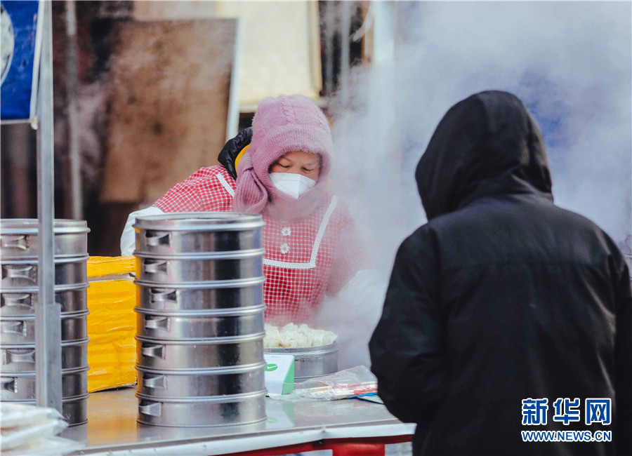 2023年1月1日,在沈陽市皇姑區明廉早市,賣早點的商鋪正在將一屜屜熱騰騰的早點搬上桌子售賣。新華網夏銘陽攝