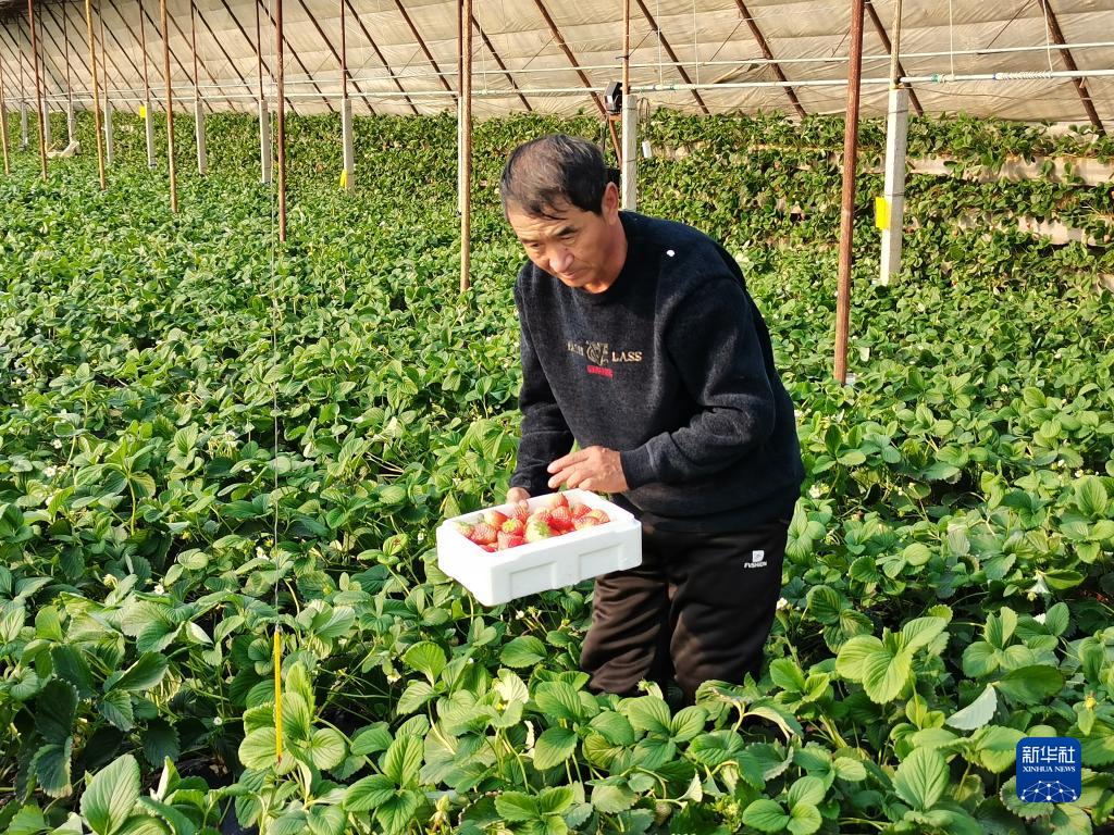 朱奎賢在大棚里采摘草莓。新華社記者張博群 攝