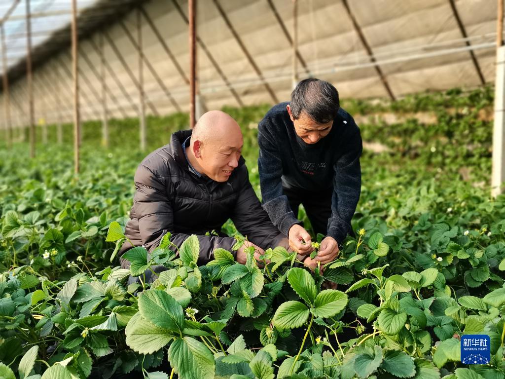 姜洪波(左)與朱奎賢(右)在觀察草莓長勢。新華社記者張博群 攝