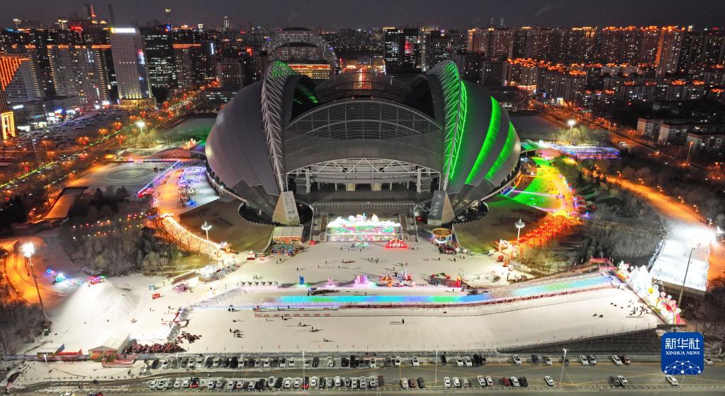 1月3日,游客在沈陽奧體中心冰雪嘉年華里體驗冰雪娛樂項目(無人機照片)。新華社記者 楊青 攝