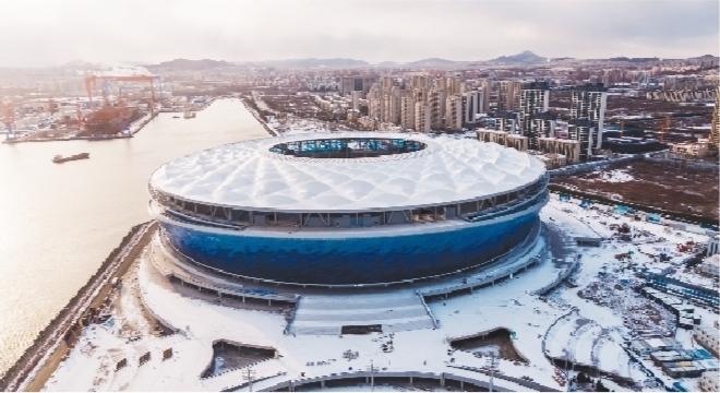 大連梭魚灣足球場是中國首座三面環海的專業足球場,項目建設已進入收官階段。于炳佳 攝