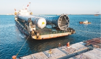 總投資500億元恒力聚酯科技產業園內,首臺大型塔器從產業園新建自備碼頭安全運抵項目現場。孫鵬偉 攝