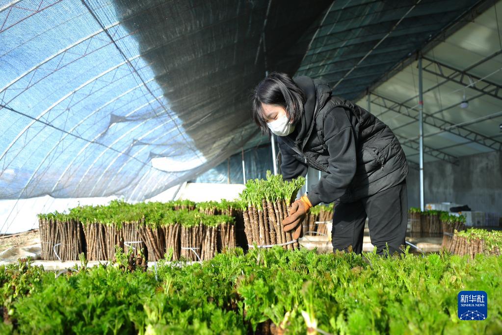 1月9日,在新民市大民屯鎮毓寶臺村大棚里,農民將一捆刺嫩芽放到培育池內。新華社記者 楊青 攝