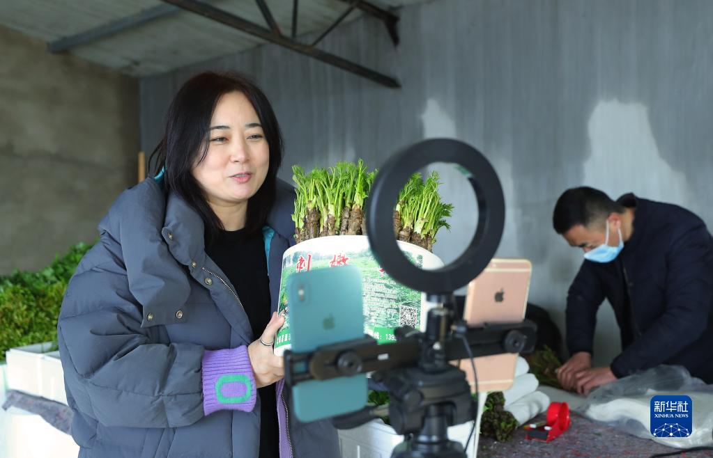1月9日,在新民市大民屯鎮毓寶臺村大棚里,農民在大棚里直播銷售刺嫩芽盆栽。新華社記者 楊青 攝
