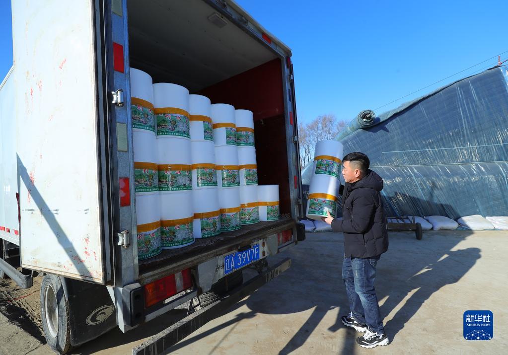 1月9日,在新民市大民屯鎮毓寶臺村,農民裝運包裝好的刺嫩芽盆栽。新華社記者 楊青 攝