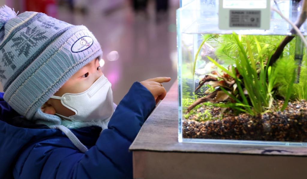 1月19日,一名小朋友在沈陽北市花鳥魚市場里觀看觀賞魚。新華社記者 姚劍鋒 攝