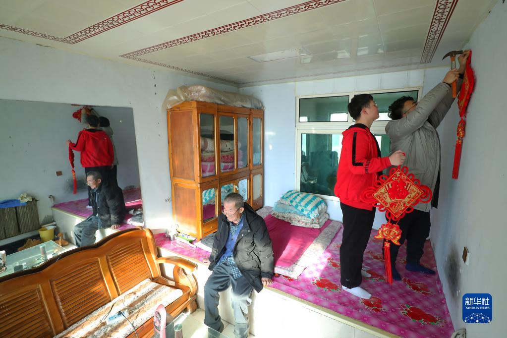 1月20日,沈陽工學院老師和李天騏(右二)一起掛中國結。新華社記者 楊青 攝