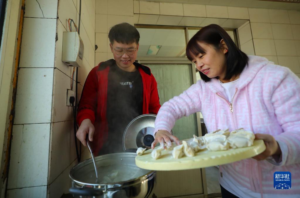 1月20日,沈陽工學院老師和李天騏(左)一起煮餃子。新華社記者 楊青 攝