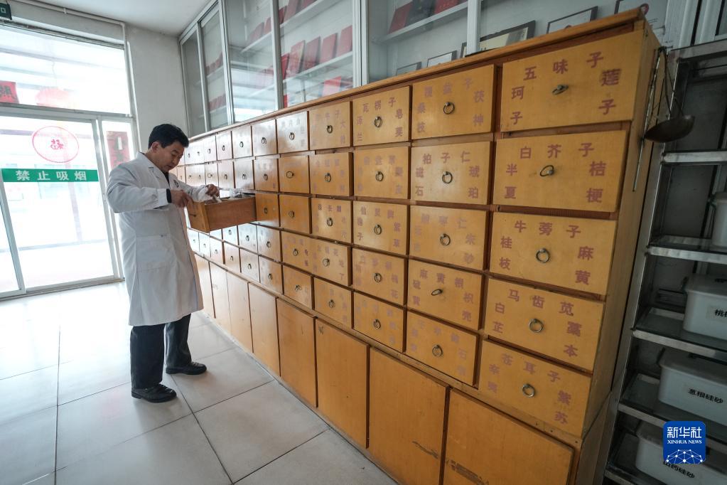 梁春榮正在檢查中藥柜里的備藥是否充足(新華社記者 潘昱龍攝)