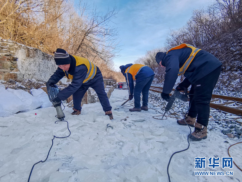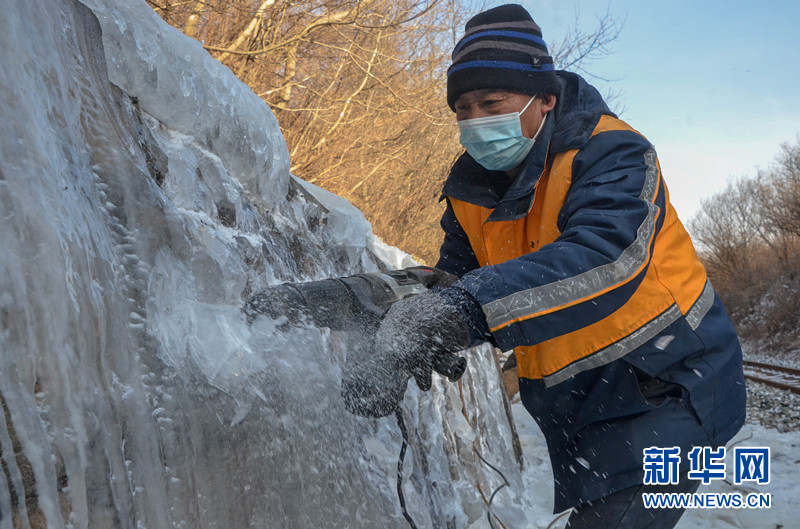 深冬的遼東山區室外溫度接近零下20攝氏度,橋隧工們一邊使用電鎬破冰,一邊用鐵鍬將碎冰塊清除到線路兩邊,冰渣混著山水在作業人員身上凍結,讓橋隧工們穿上了“冰甲”。