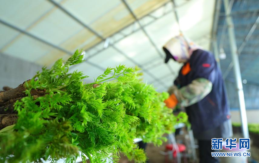 在新民市大民屯鎮毓寶臺村大棚里,農民在分揀刺嫩芽。新華社記者 楊青 攝