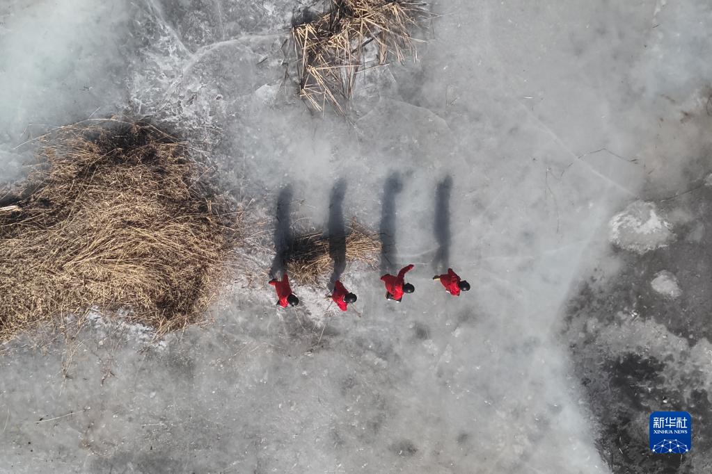 2月6日,中國石油遼河油田興隆臺輸氣分公司巡線工人在進行巡線工作(無人機照片)。新華社記者 潘昱龍 攝