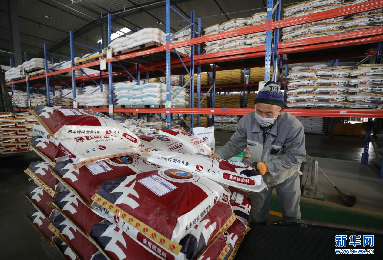 在禾豐牧業沈北飼料工業園生產車間,工人在搬運飼料。新華社記者 楊青 攝