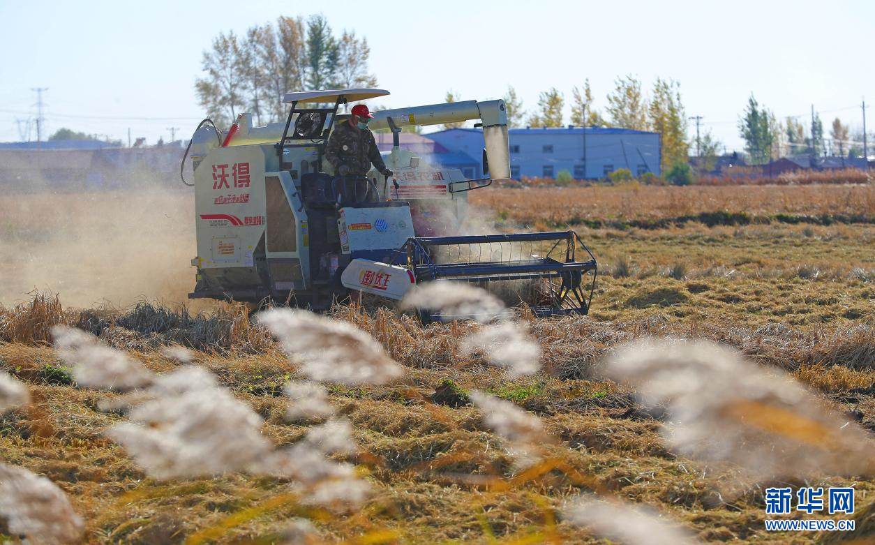 在遼寧沈陽市沈北新區的田野上,收割機在收割水稻。新華社記者 楊青 攝